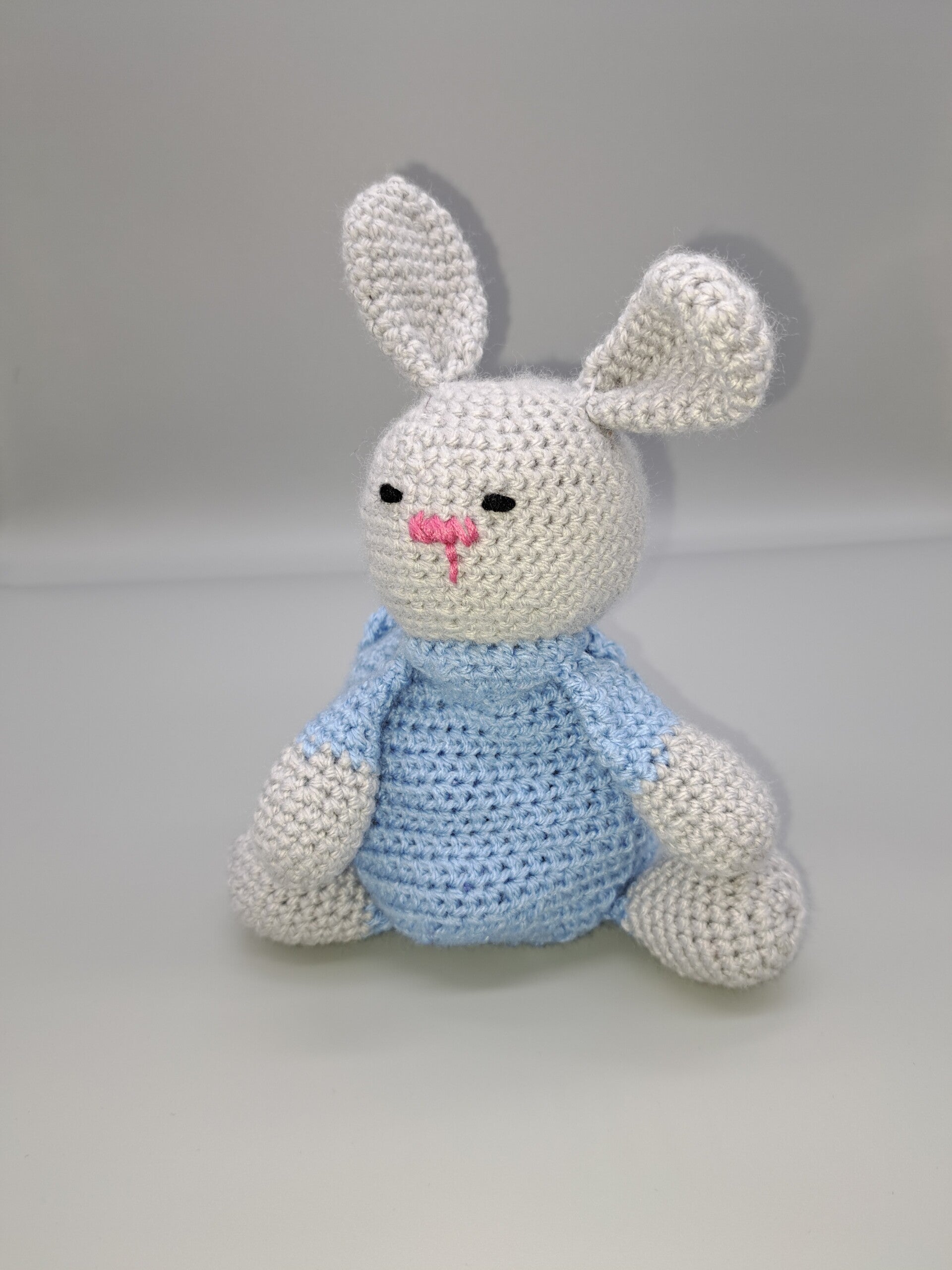 Dieser gehäkelte Hase kann mit leckeren Osternaschereien gefüllt werden.