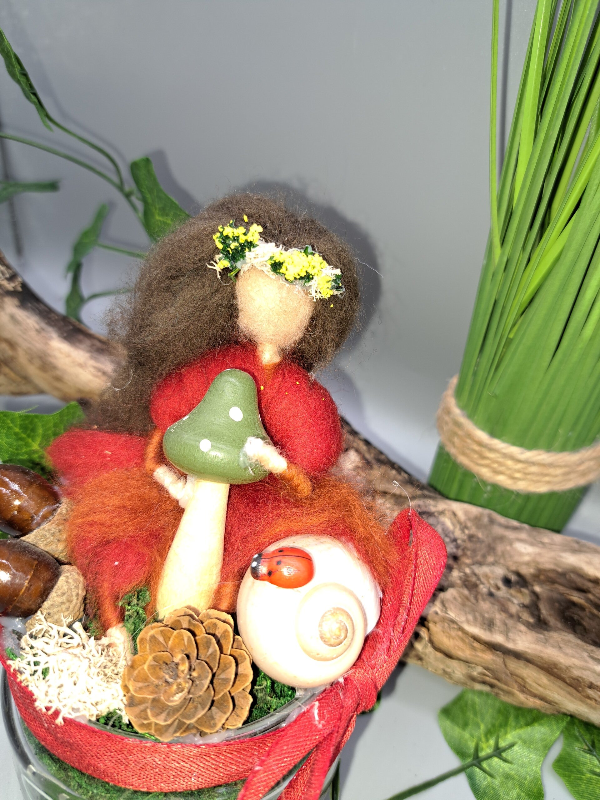 Die Figur ist aus hochwertiger Merino - Filzwolle in Handarbeit gefertig. Pilze aus Holz und verschiedene Naturmaterialien machen das Glas zu einem echten Hingucker.
