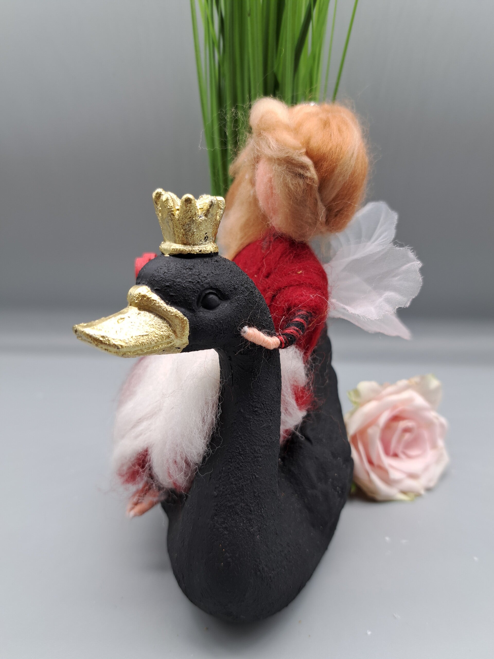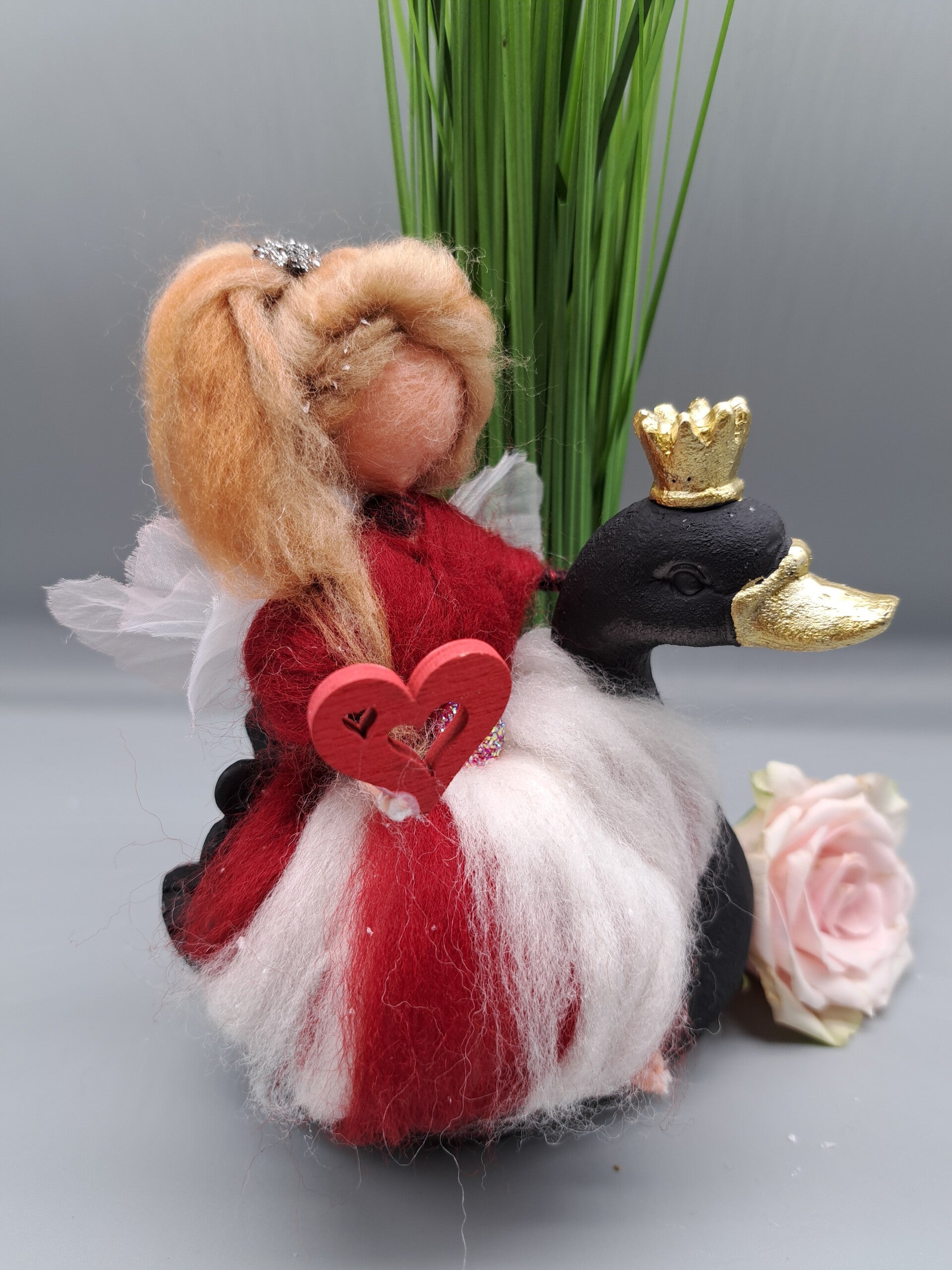 Sie sitzt auf einem Dekorschwan und hält ein rotes Herz in der Hand.