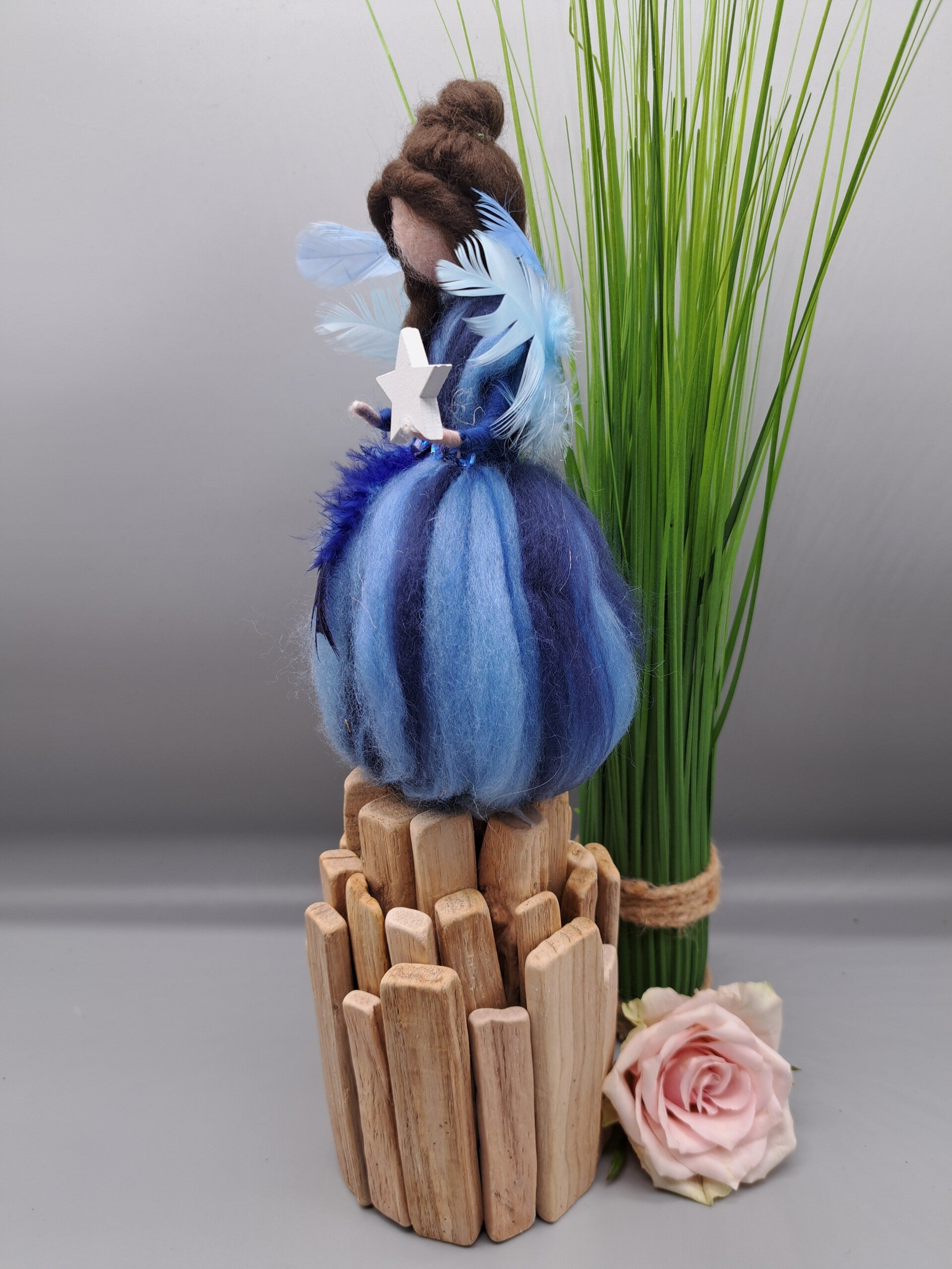 Diese gefilzte Fee steht auf einem ansehlichen Holzpodest. In der Hand hält sie einen weißen Holzstern.