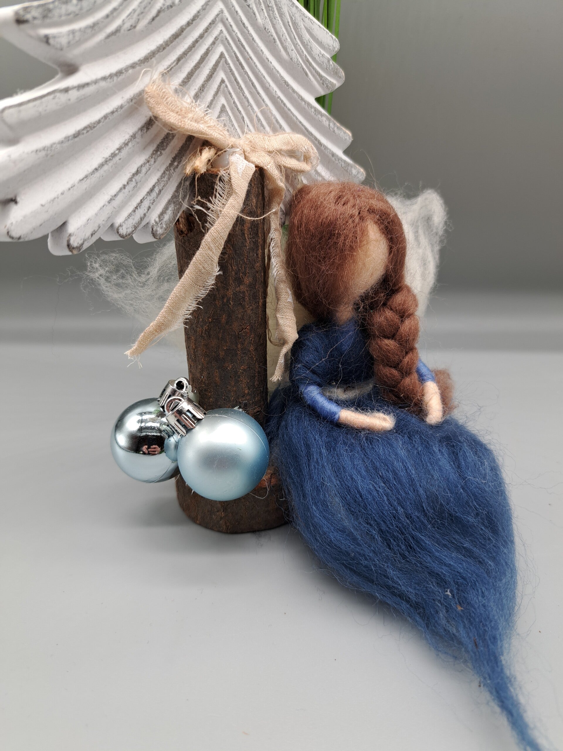 Diese gefilzte Fee sitzt gemütlich unter einem weihnachtlichen Tannenbaum aus Holz.
