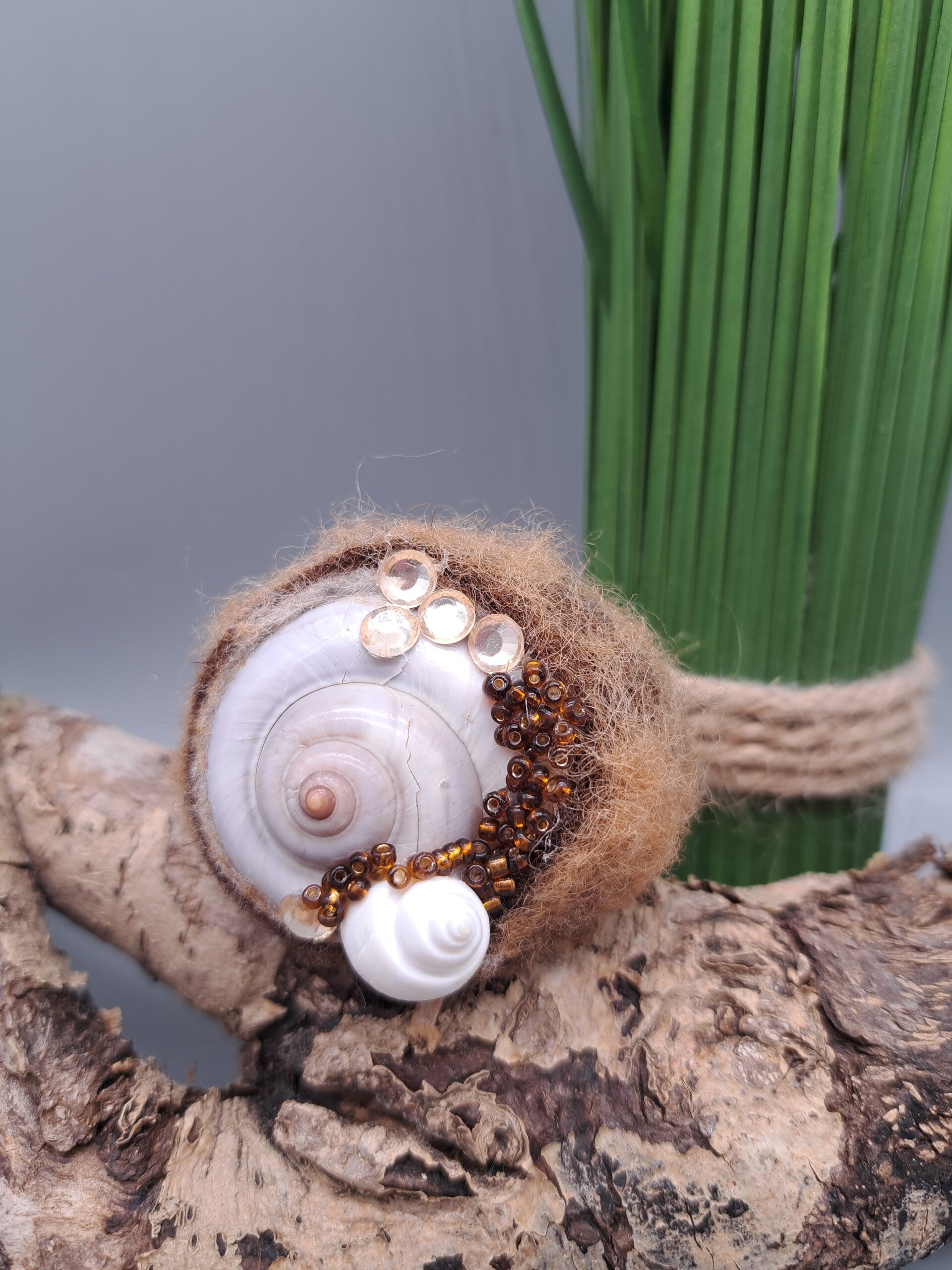 Das Schneckenhaus hat einen Durchmesser von ungefähr 5 cm. Es wurde mit hochwertiger Filzwolle umfilzt. Strasssteine und Muscheln veredeln das Schneckenhaus.