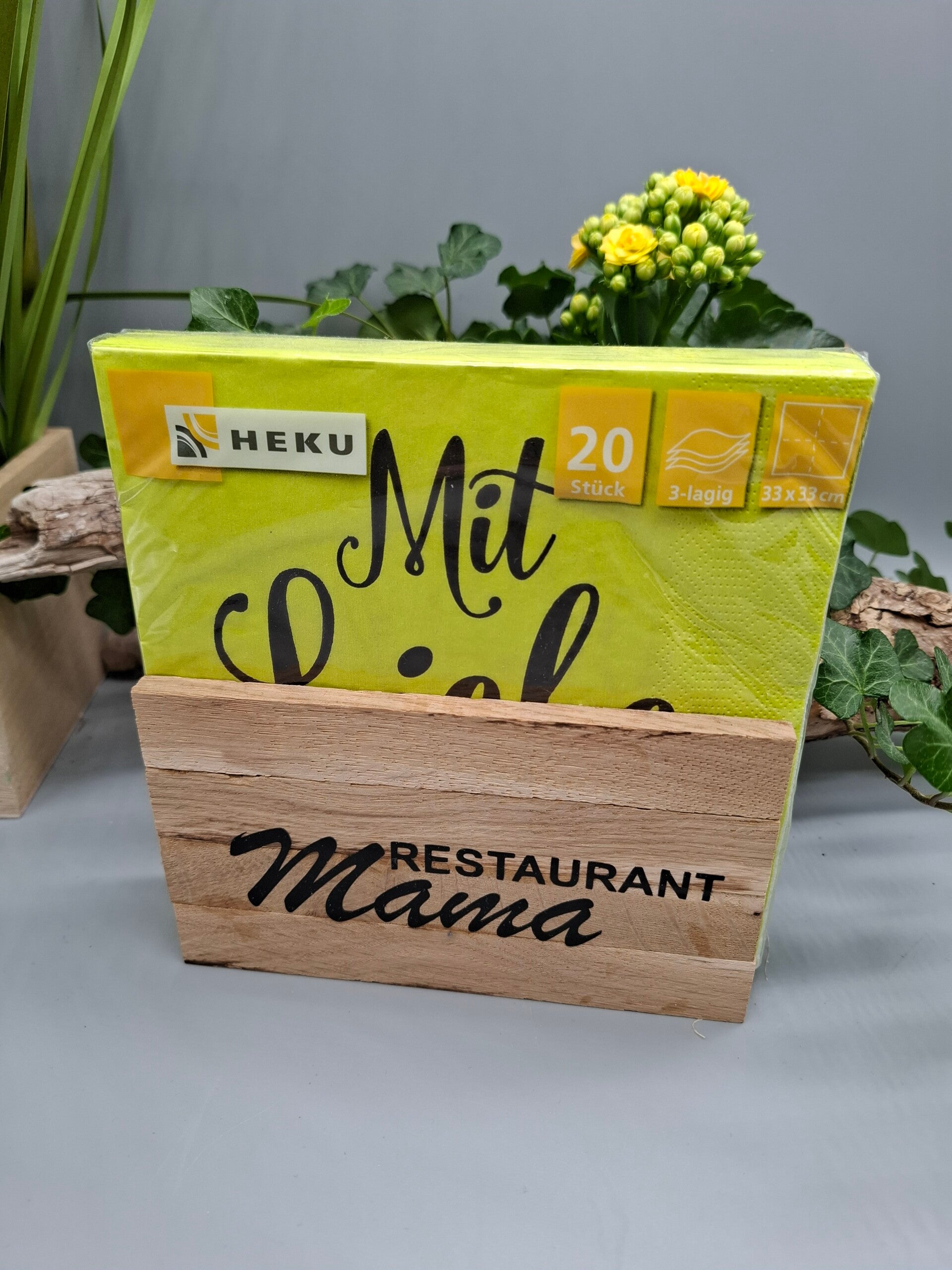 Dieser aus Holz gearbeitete Serviettenhalter ist 16cm breit und 10cm hoch.