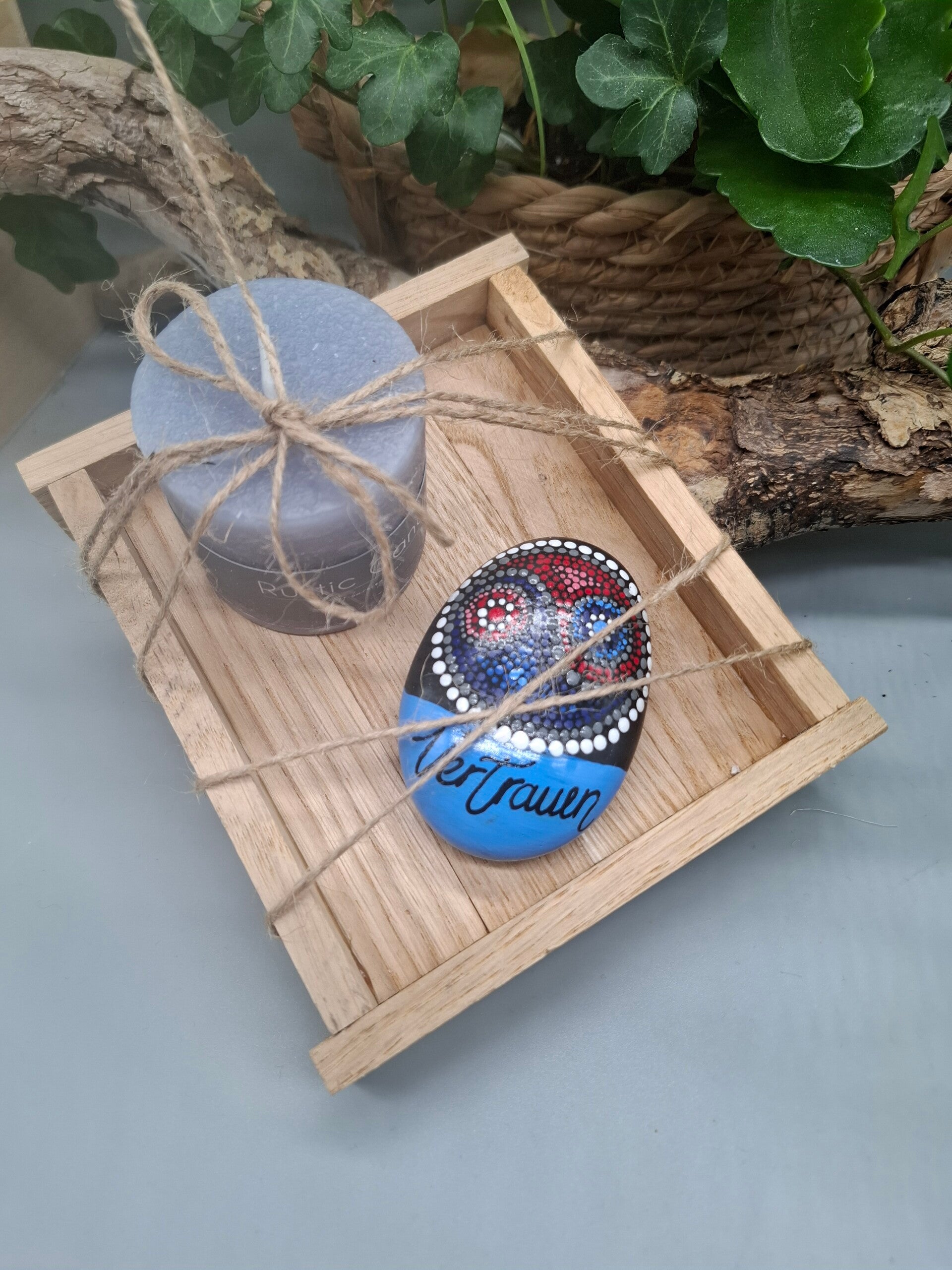 Dieses Set besteht aus einer kleinen Kerze und einem Ying und Yang Mandalastein.
