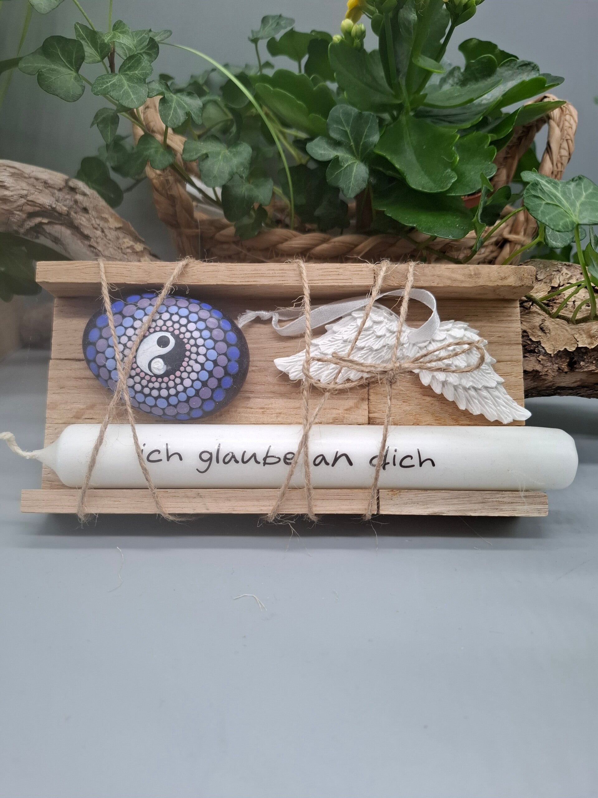 Dieses Gesechenkset besteht aus einem Mandalastein mit einem Ying und Yang Zeichen, einer Kerze mit der Schrift "Ich glaub an dich" und einem Engelsflügelanhänger.