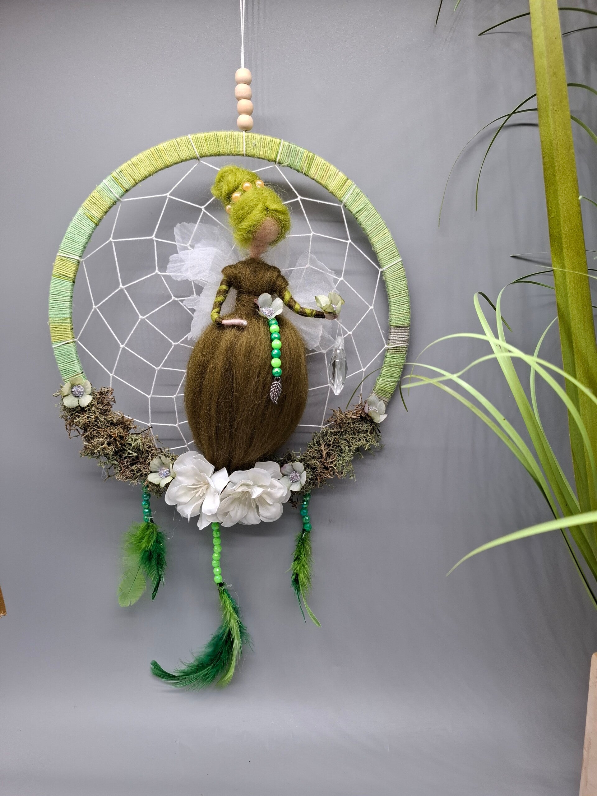 Die Fee ist mit hochwertiger Filzwolle gefilzt. In der Hand hält die Fee ein Kristall - Sonnenprisma. Tagsüber ein tolles Lichtspiel bei Sonnenschein, und in der Nacht sorgt der Traumfänger für einen angenehmen Schlaf.