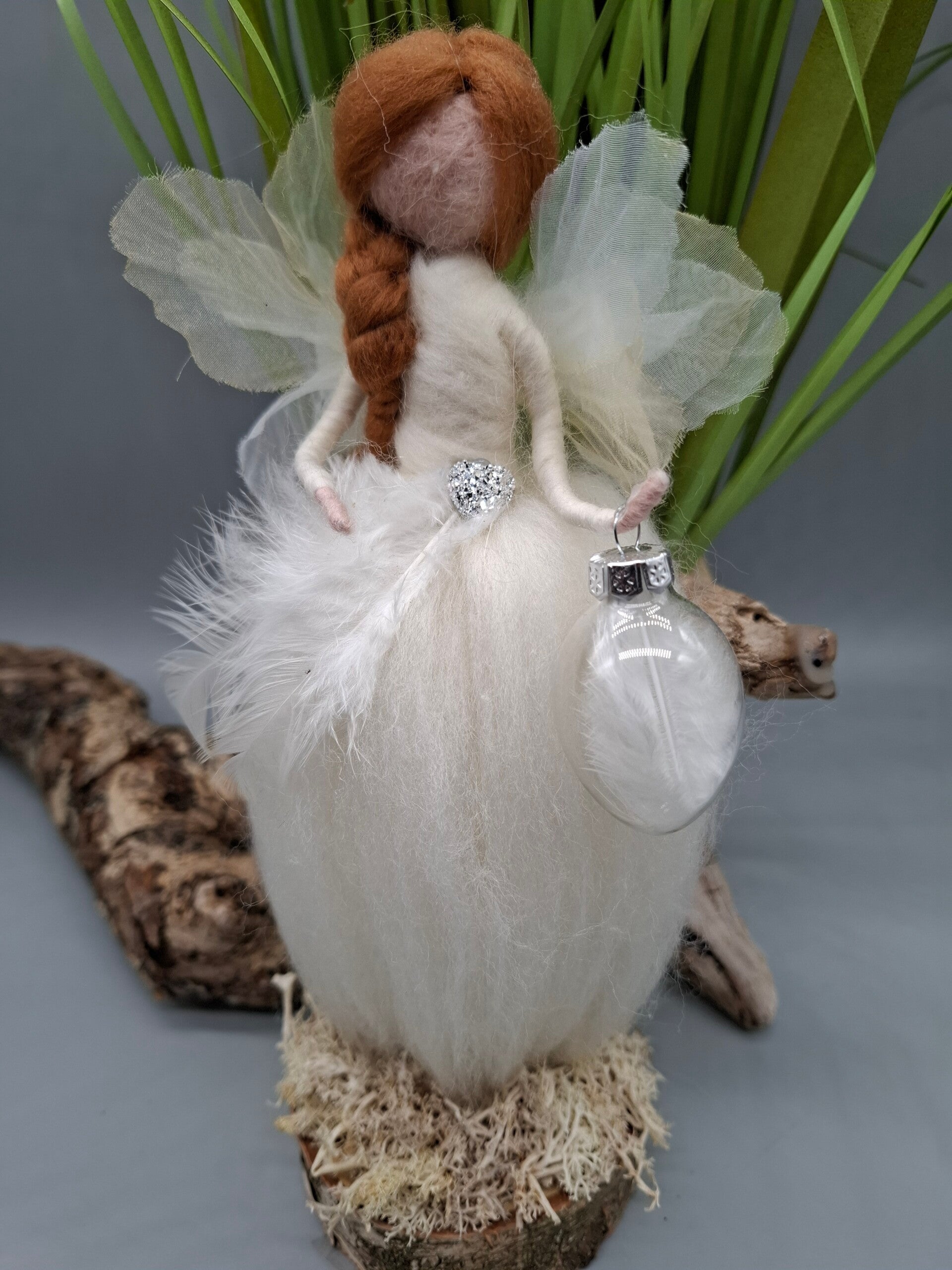Diese Fee steht auf einer Holzscheibe, die mit Moos verziert ist.