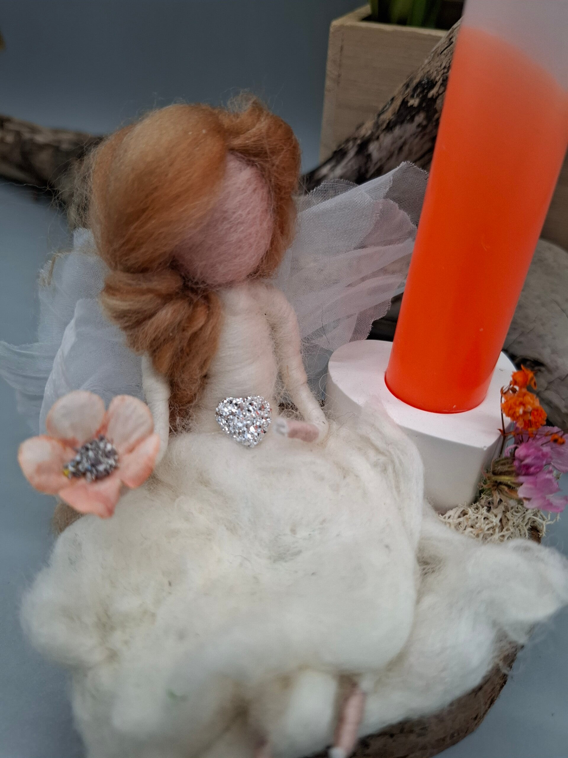 Diese gefilzte Fee sitzt auf einer Holzscheibe.