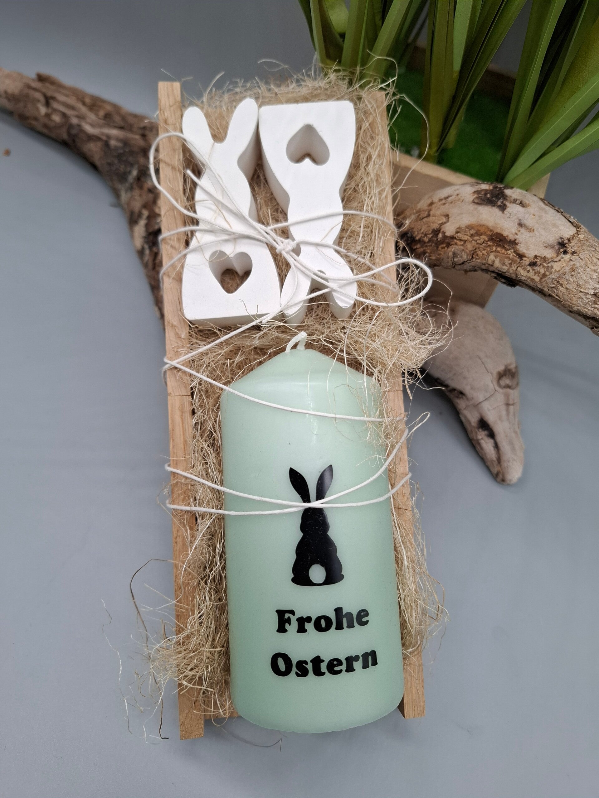 Diese Geschenkset beinhaltet eine Stumpkerze mit der Aufschrift "Frohe Ostern" und 2 kleinen Dekohasen.