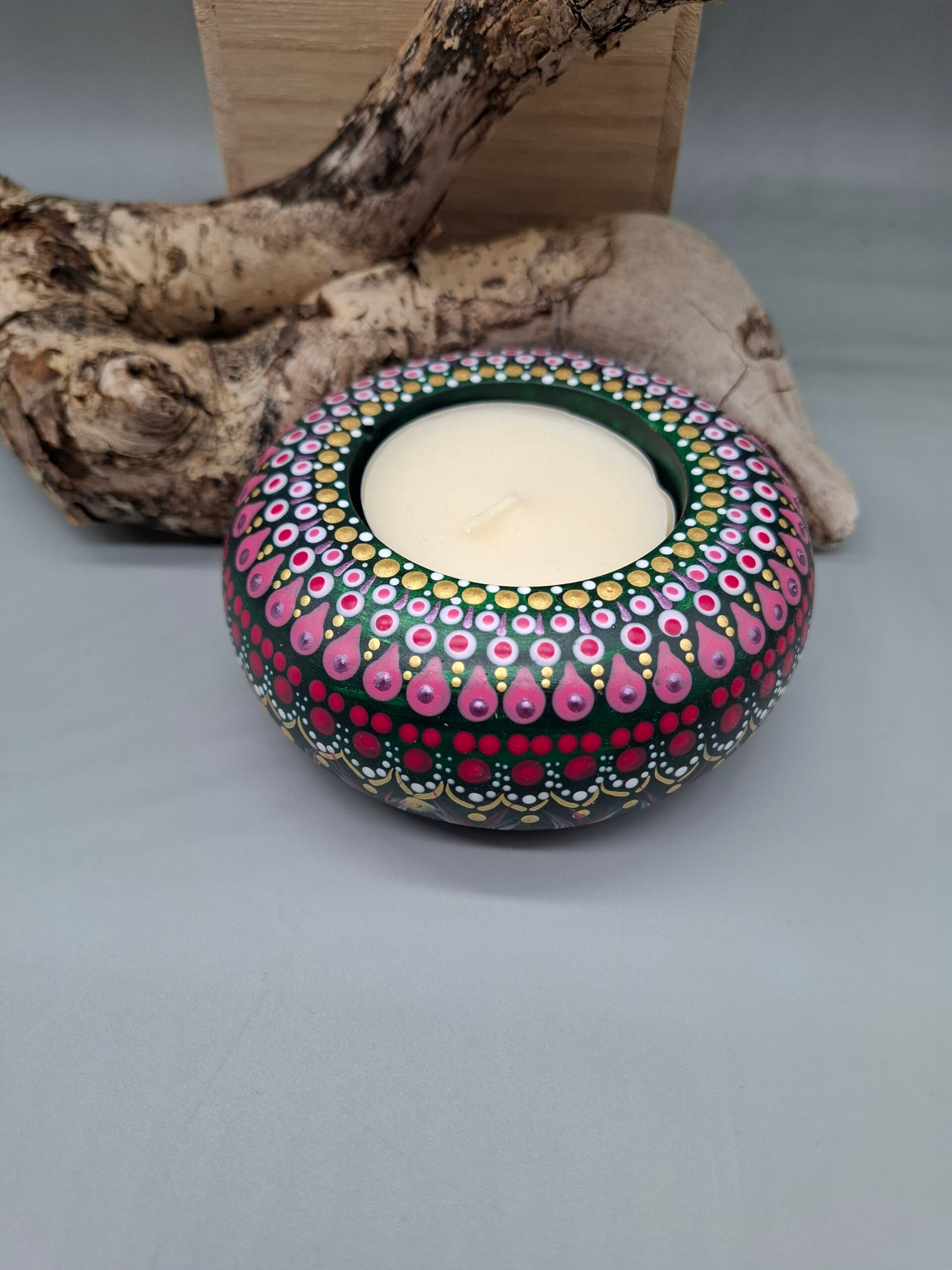Dieser Kerzenhalter ist aus Beton gegossen und mit der Punktmalerei bemalt. Er hat einen Durchmesser von ca. 12 cm.