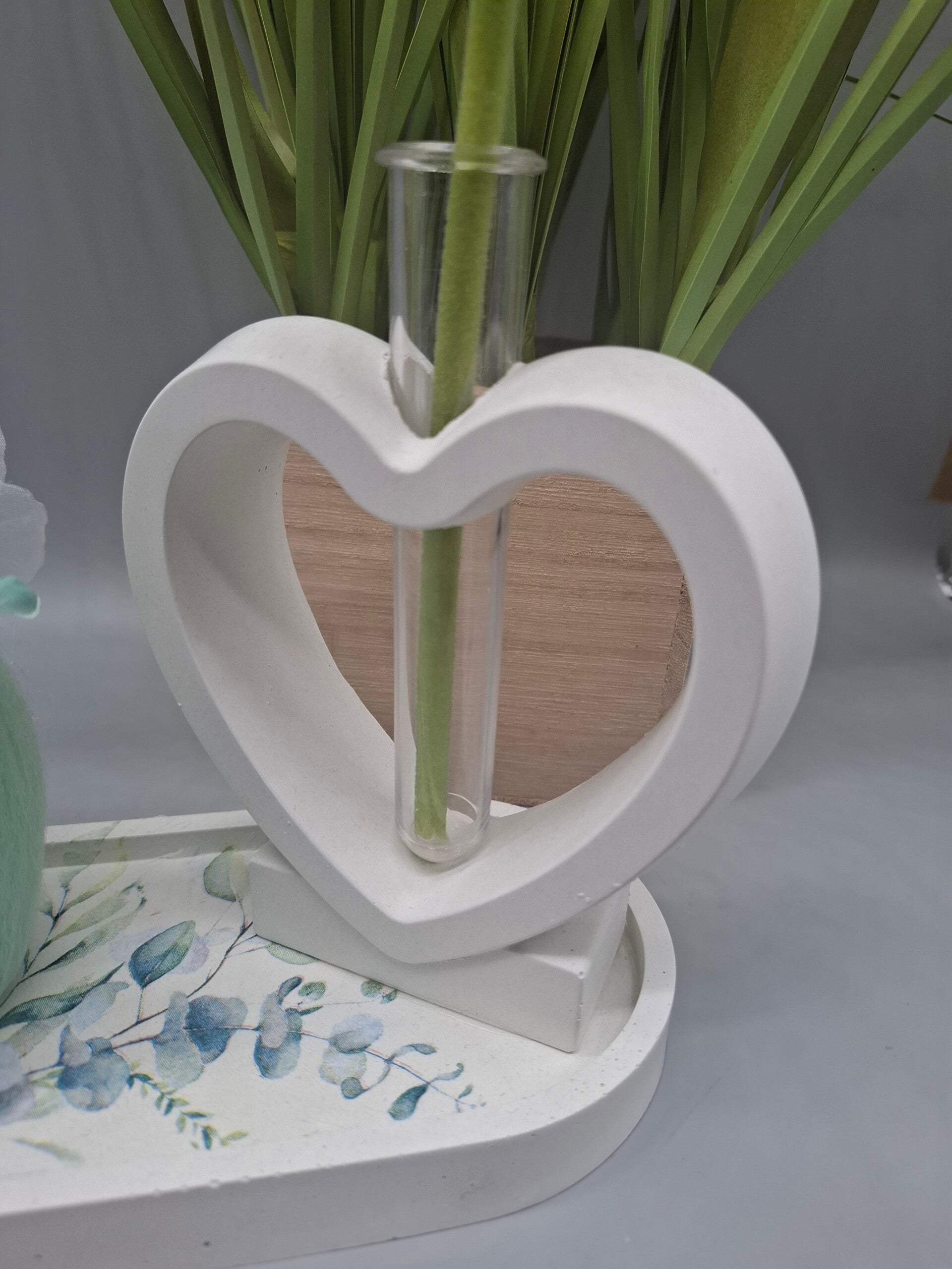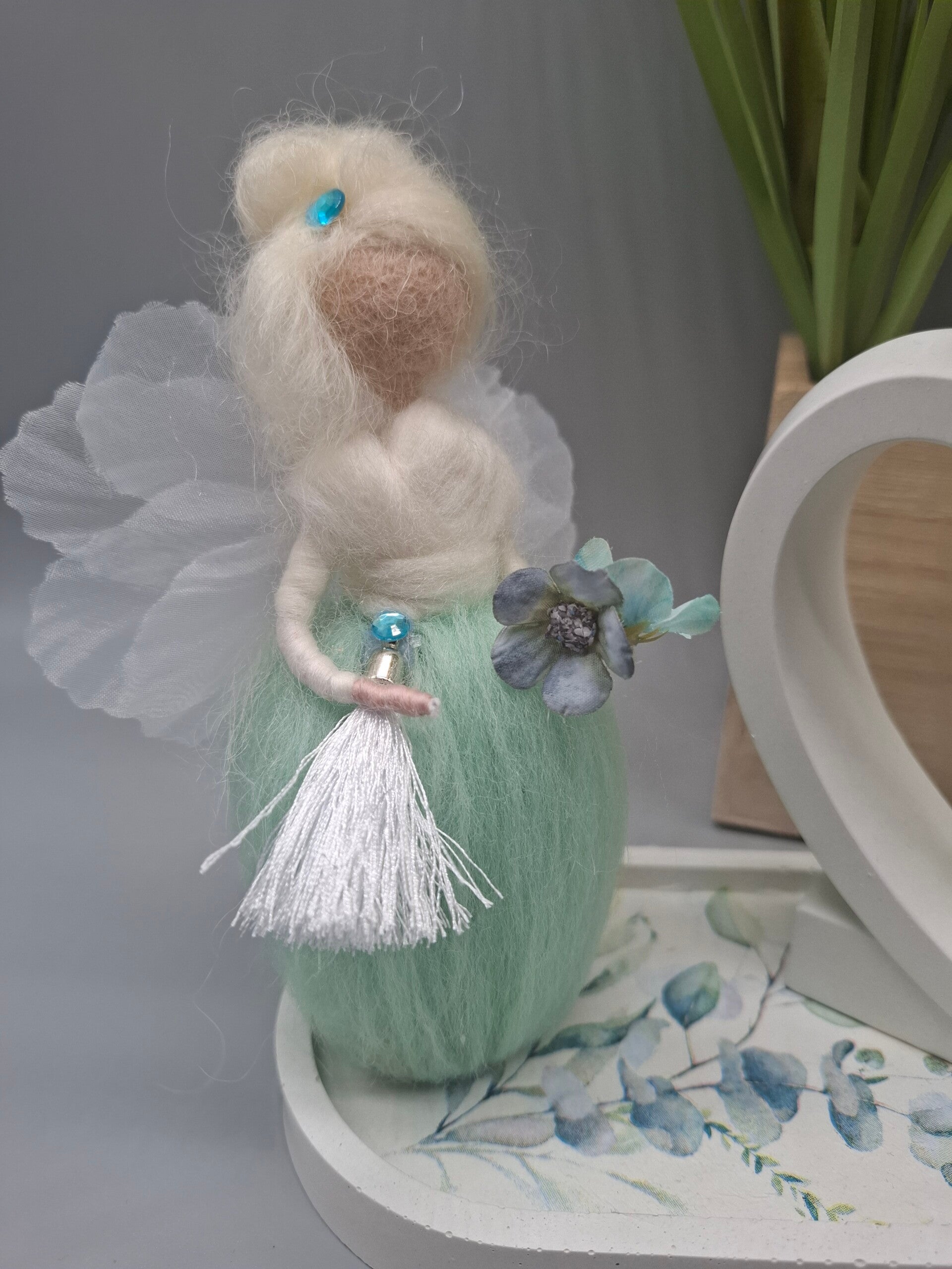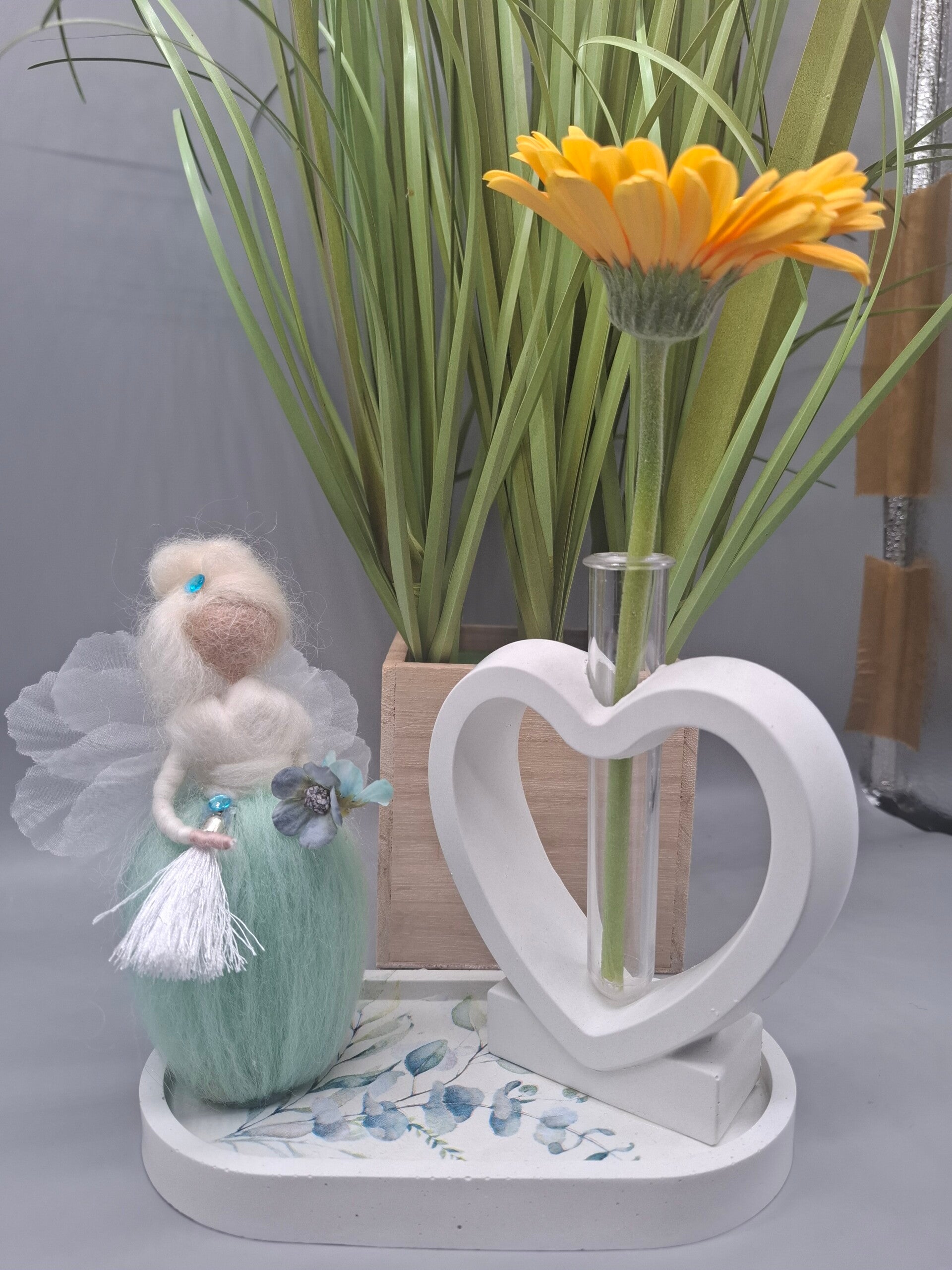 Diese Fee ist aus hochwertige Merino-Filzwolle gearbeitet. Sie steht auf einem handgegossenen Tablet aus weißem Beton. Das Herz, welches ein Reagenzglas als Vase hält, ist ebenfalls aus weißem Beton gegossen.
