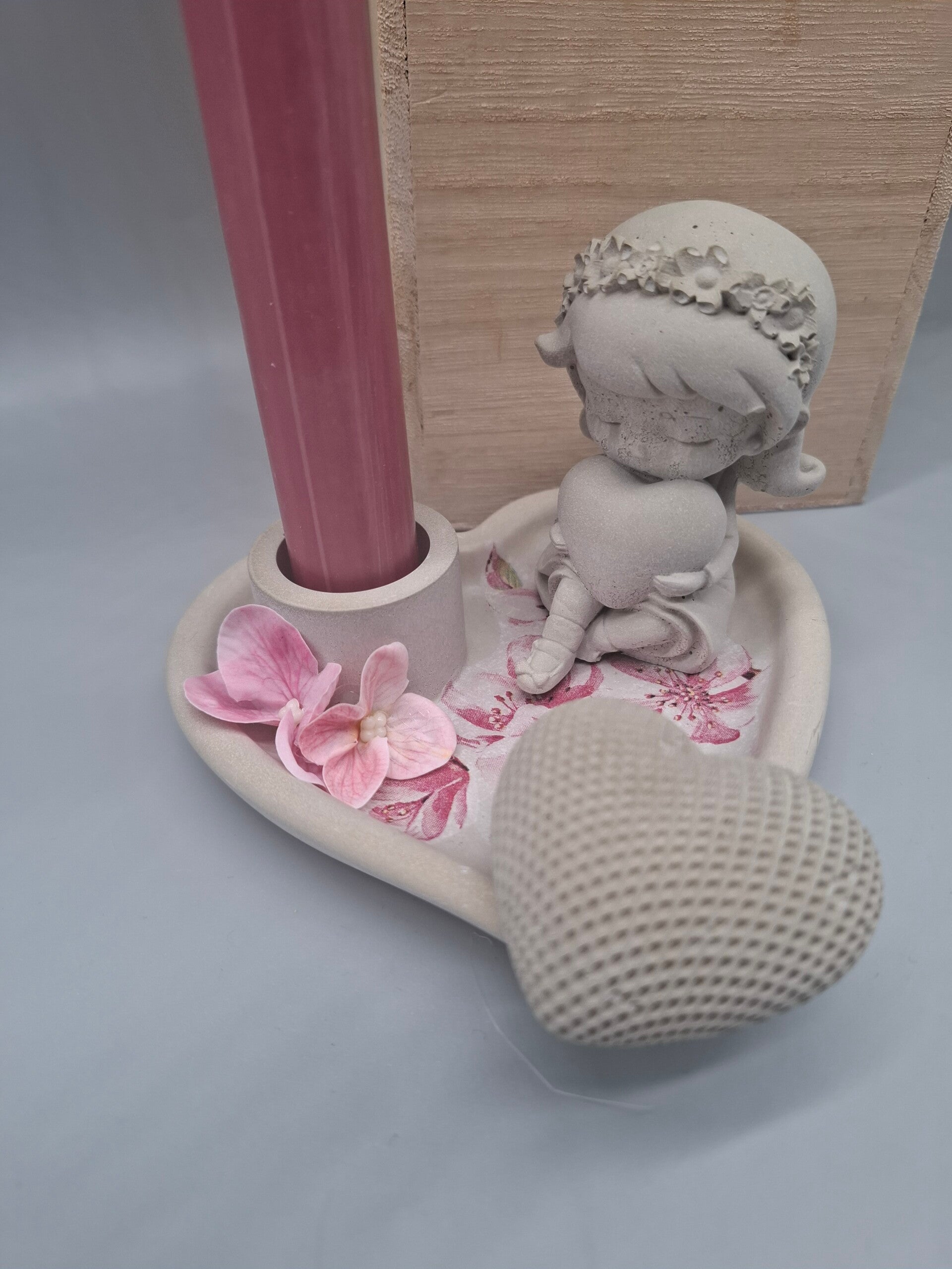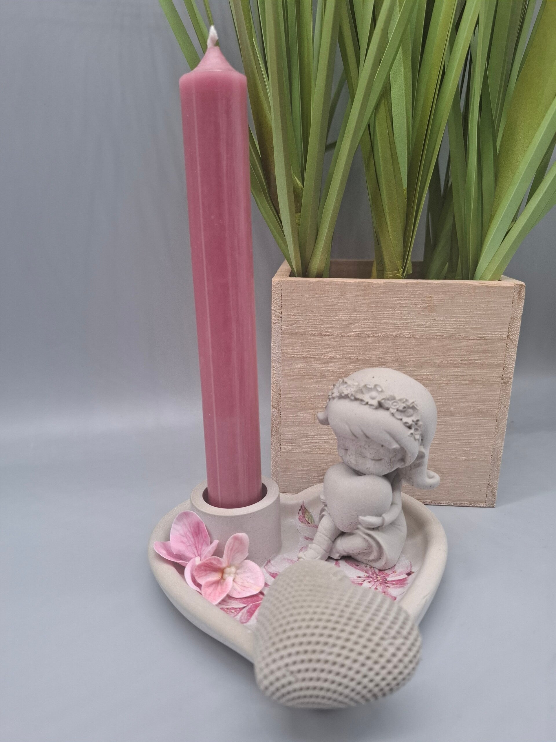Die kleine Dekofee mit Herz und das große Herz sind ebenfalls handgegossen aus Beton. Rosa Horthensien verleihen dem Kerzenhalter Charm.