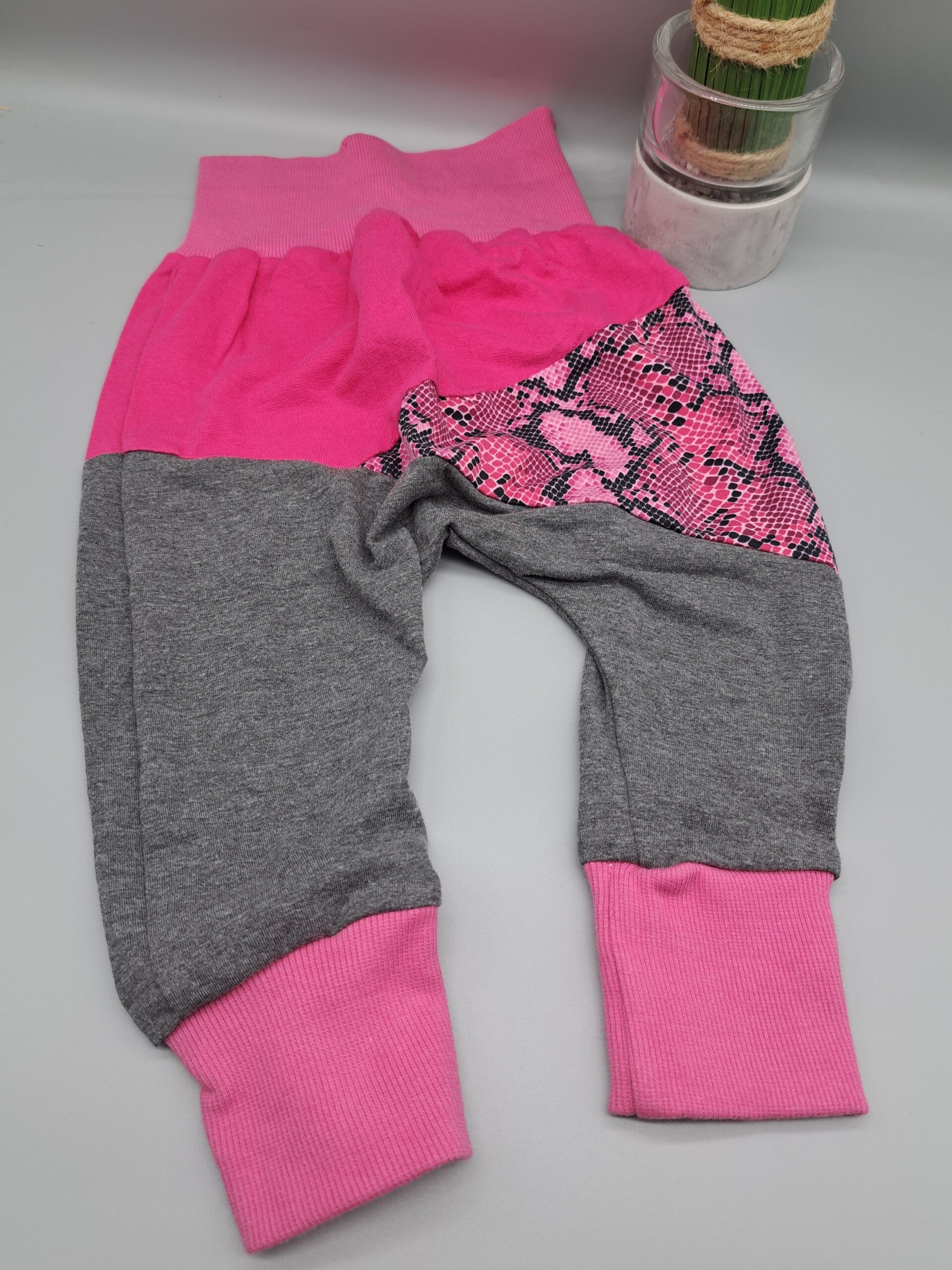 Diese Hosen sind aus Jerseystoff genäht. Dank dem Bein- und Bauchbund wachsen die Hosen mit und sorgen so für viel Bewegungsfreiheit. Sie sitzen im Schritt sehr locker, was richtig lässig aussieht.