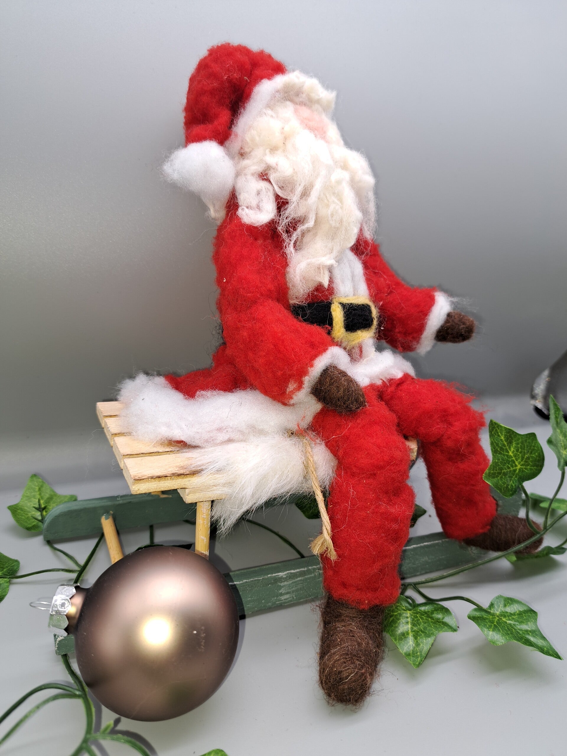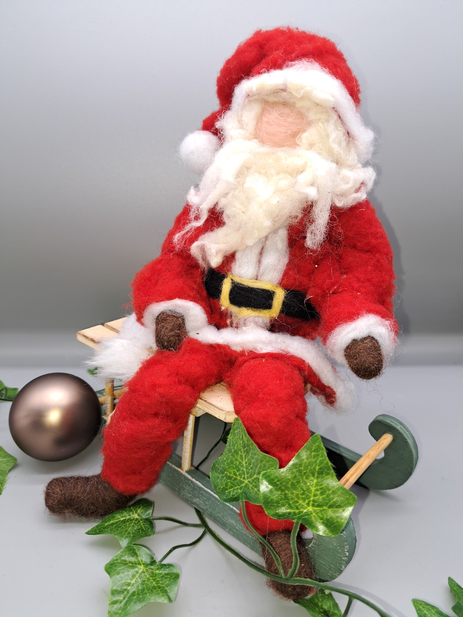 Dieser aus Merinowlle gefilzte Weihnachtsmann sitzt auf einem Holzschlitten.