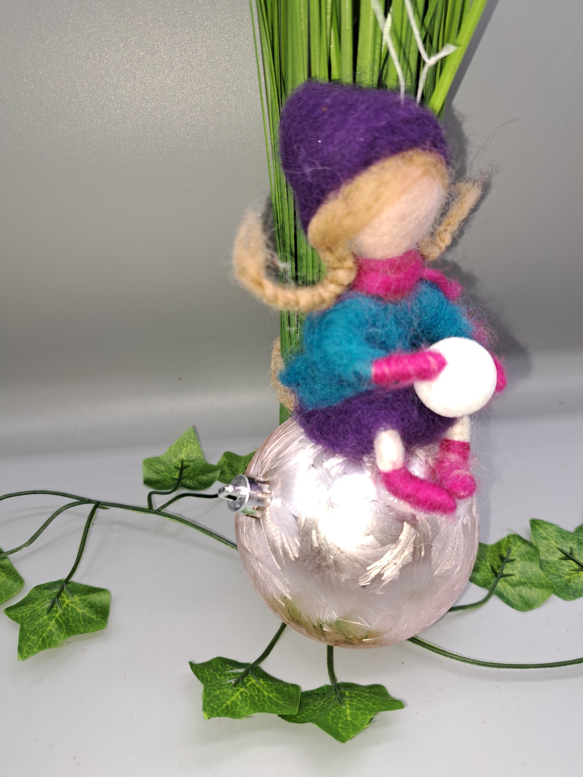 Auf dieser rosa Christbaumkugel sitzt ein gefilztes Mädchen mit einer Schneekugel in der Hand.
