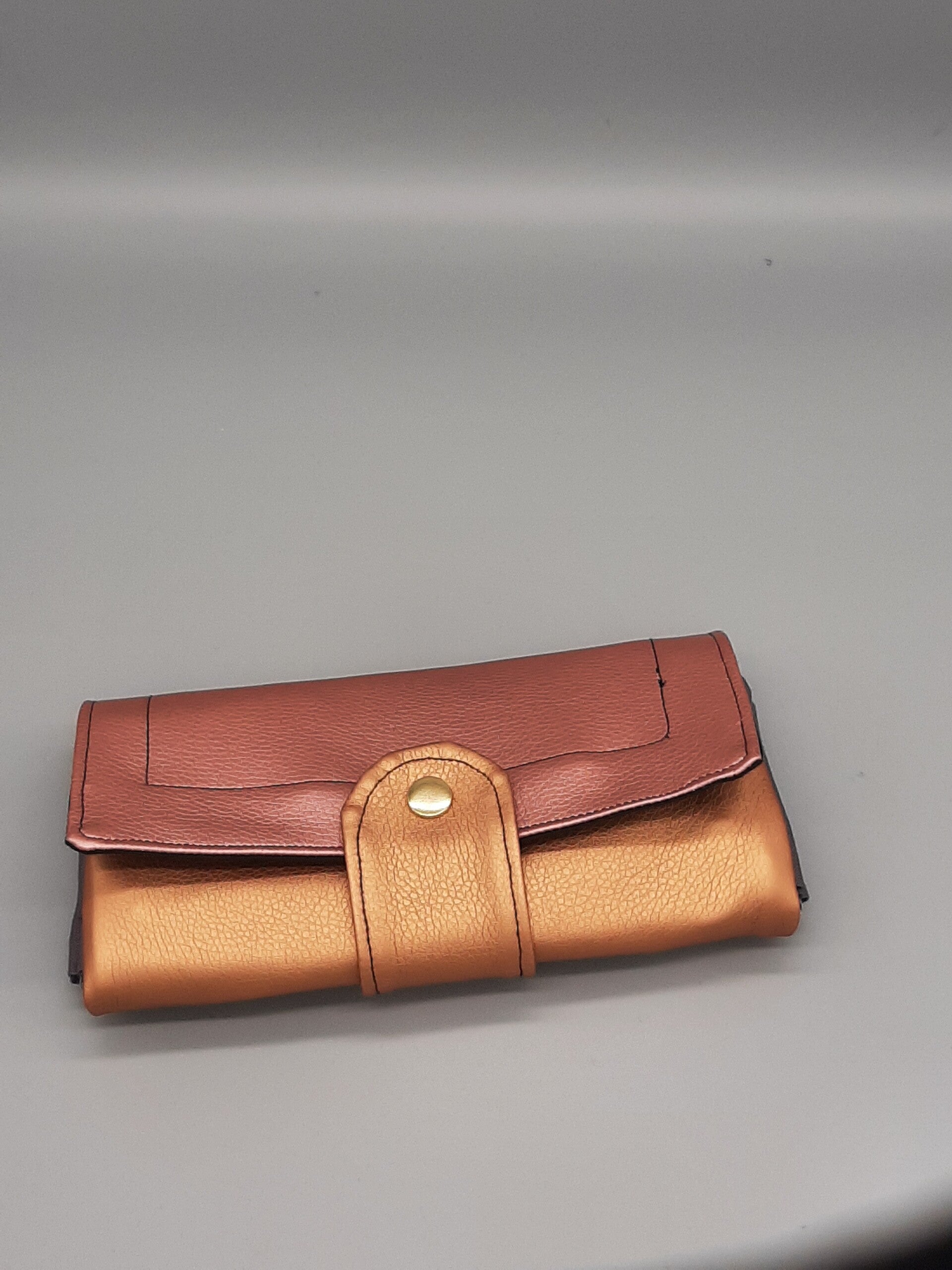 Diese Geldbörse wurde aus Kunstleder und Baumwollstoff gefertigt.