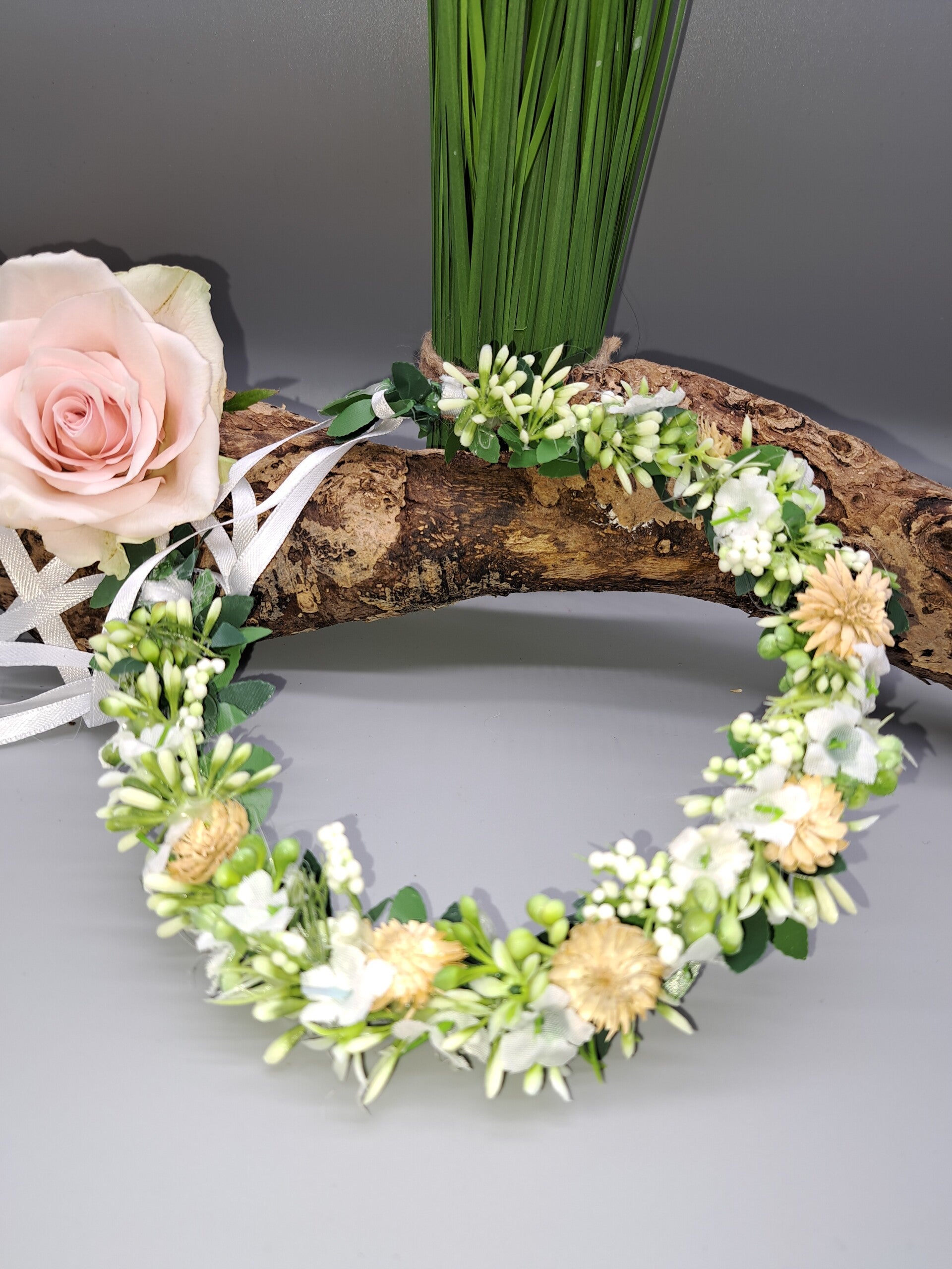 Dieser Haarkranz wurde mit Kunstblumen gefertigt. Dank dem eingearbeiteten Draht und dem Satinband zum Binden passt sich der Haarkranz jeder Kopfform und Kopfgröße an.