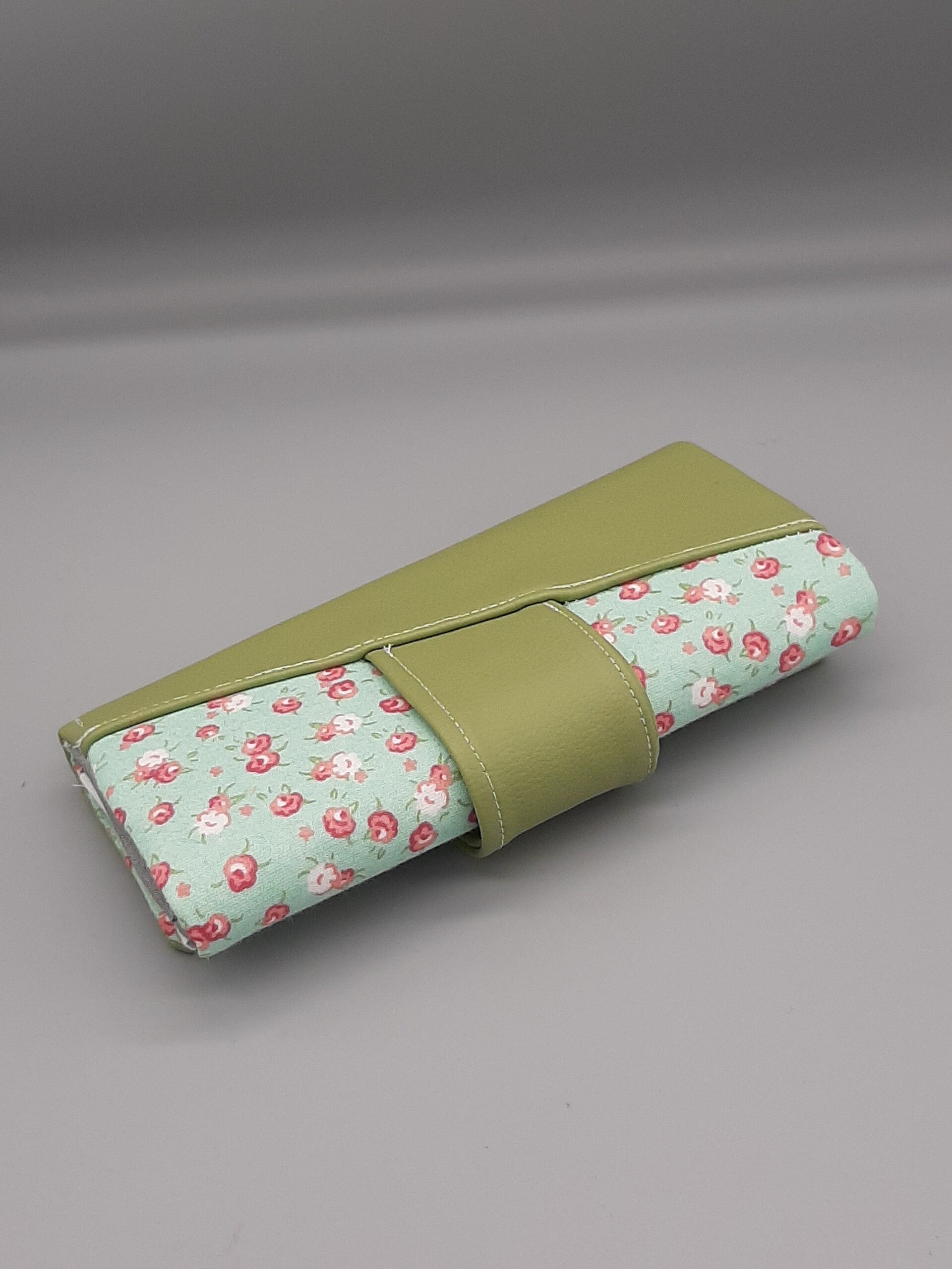 Diese Geldbörse wurde aus Kunstleder und Baumwollstoff gefertigt.