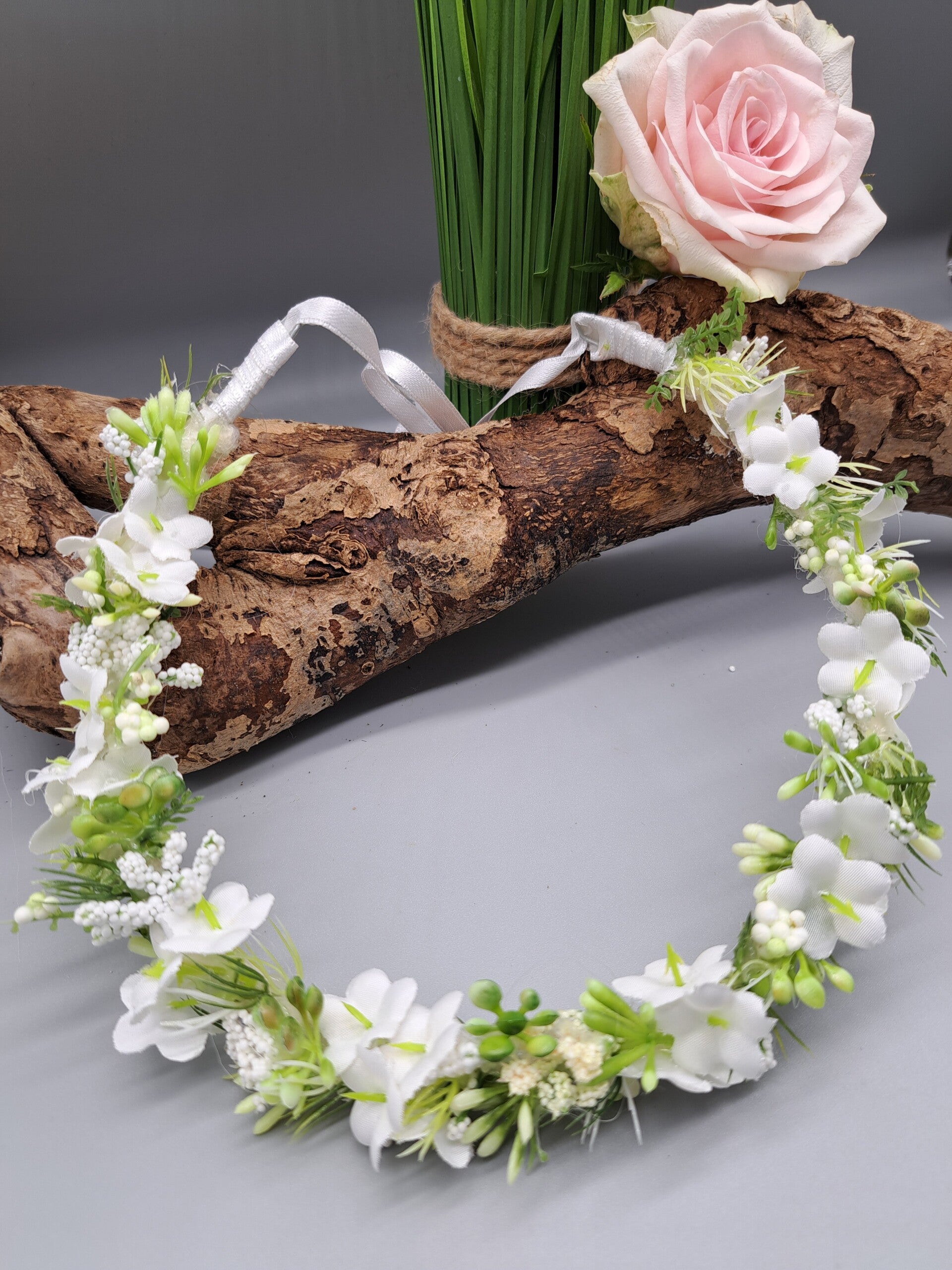 Dieser Haarkranz wurde mit Kunstblumen gefertigt. Dank dem eingearbeiteten Draht und dem Satinband zum Binden passt er sich jeder Kopfform und Kopfgröße an.